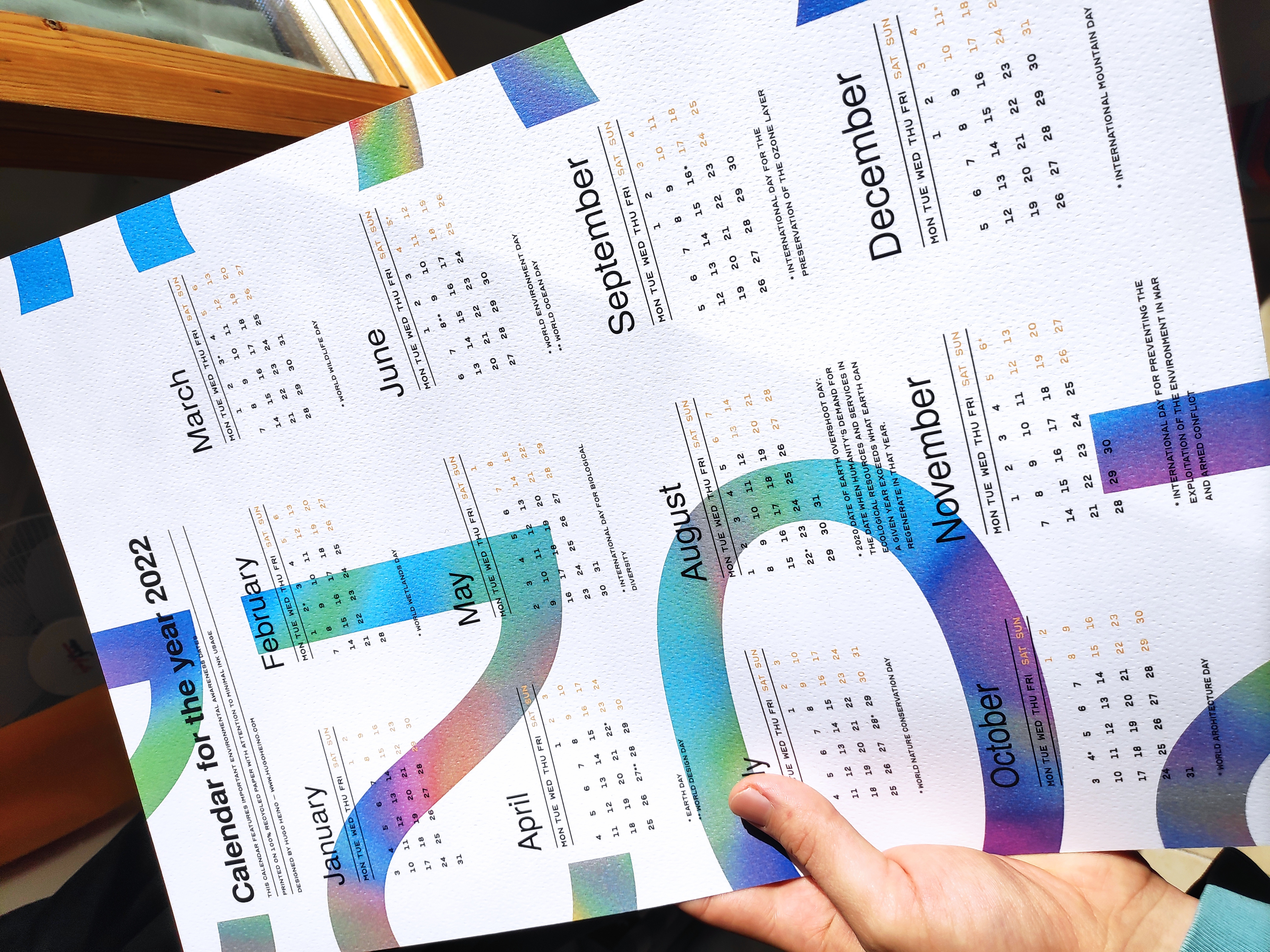 Calendar for the year 2022. Beautiful holo-style gradient colors printed on 300 gsm art paper.